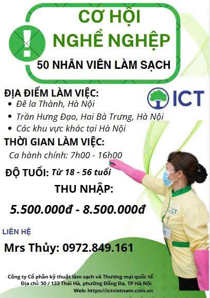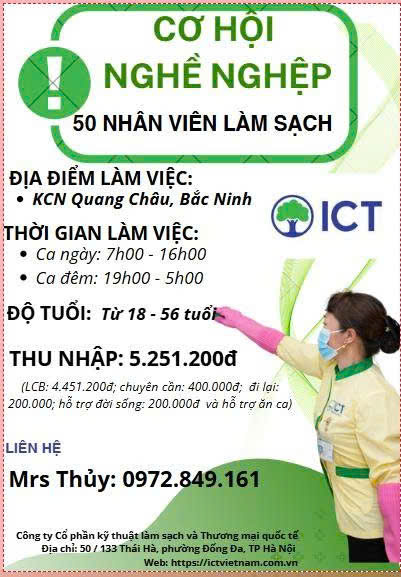 Công ty vệ sinh ICT cần tuyển gấp lao động phổ thông đi làm ngay.